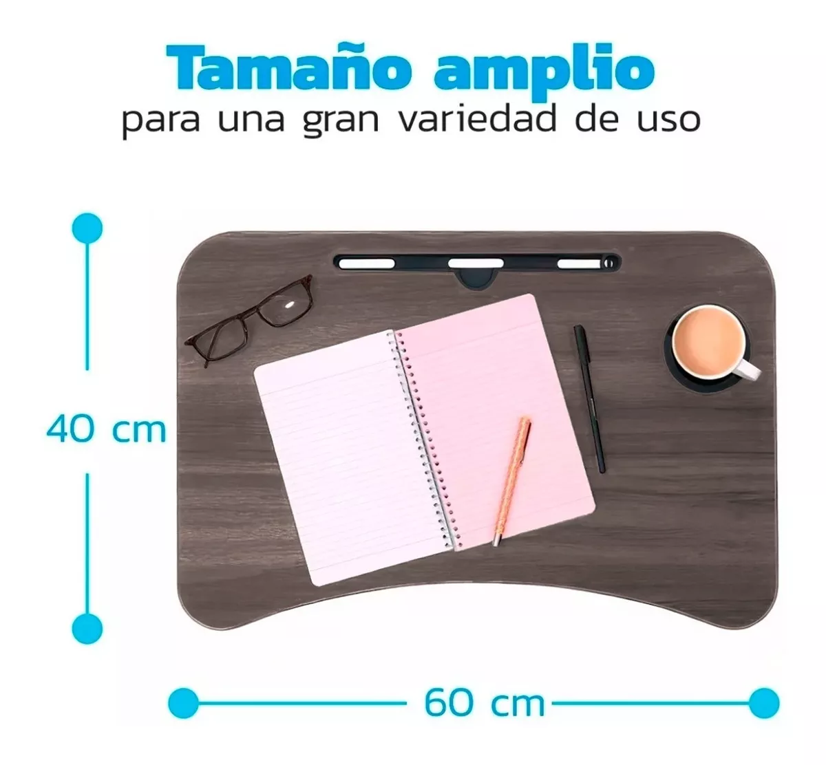 MESA PLEGABLE MULTIFUNCIONALEsta mesa plegable se puede utilizar para tomar el desayuno, trabajar, jugar, ver videos, noticias o estudiar, y disfrutar de un día de home office, posee una ranura para adecuar tabletas, celulares y accesorios como un libro, desde su cama, sofá o parque.MUCHOS USOS EN UNOSe puede utilizar como una mesa, bandeja de desayuno, escritorio para portátil, bandeja de cama, escritorio plegable, mesa de manualidades, con tamaño ideal para todo, 60 cm. de largo x 40 cm. de ancho.EXCELENTE DISEÑODiseñada con un portavasos para evitar desagradables derrames y colocar los vasos con mayor seguridad, una hendidura para tabletas, libros y más para un uso más cómodo y funcional.FÁCIL DE TRANSPORTARSe puede transportar demasiado fácil a donde quiera que vayas, tamaño ideal para guardar debajo de un sillón, mueble y cama, diseñada para desayunar mientras trabajas, lleva fácilmente la mesa a cualquier lugar ya que es demasiado ligera.ERGONÓMICA Y CÓMODALa mesa proporciona comodidad y ergonomía de uso lo que protege su columna cervical y corrige a la postura correcta para usar la computadora en todo lugar y por periodos de tiempos prolongados.