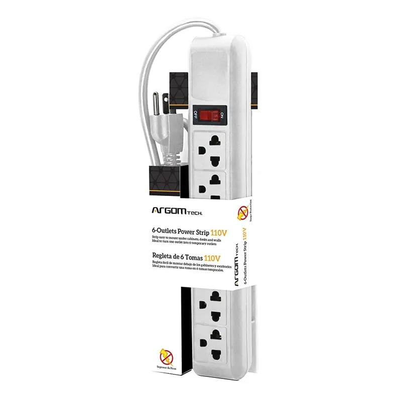 Regleta Argom ARG-AC-0252 6 Tomas BlancadescripciónTira fácil de montar debajo de gabinetes, escritorios y paredes. Ideal para convertir una salida en 6 salidas temporales.especificacionesInterruptor de encendido/apagado iluminado.6 tomacorrientes con conexión a tierra.Cable resistente de 3 pies y 15 AWG.Carcasa de plástico resistente.110/120 V CA 60 Hz.15 amperios – 1650/1800 vatios.Soportes para colgar integrados.Protección contra sobretensiones en todos los puntos de venta.
