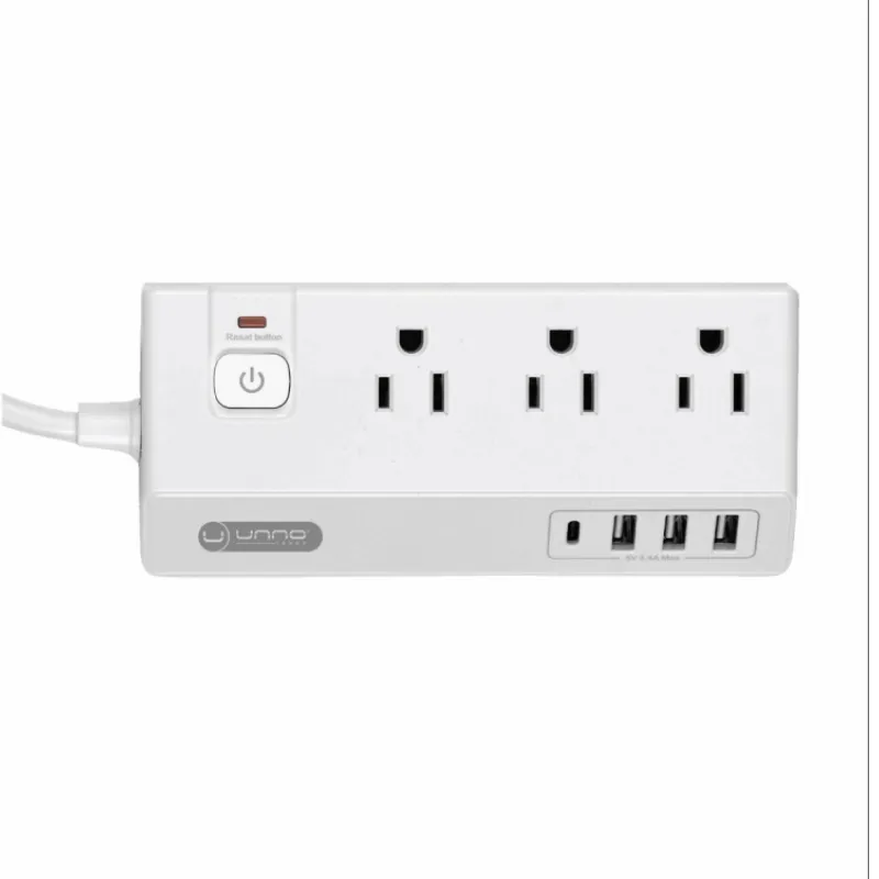 Este dispositivo es una regleta de alimentación con tres tomas NEMA 5-15R, tres puertos USB A, un puerto USB C y protección contra sobretensiones, cortocircuitos y sobrecargas. Ofrece una entrada de 110-240V y una salida USB de 5V/3,4A, además de una salida de corriente alterna de 125V/10A. Incluye un cable de 1,5 metros, un interruptor de encendido/apagado, y una carcasa ignífuga. Sus dimensiones son 6,1 x 2,8 x 1,3 pulgadas y pesa 11,40 oz.